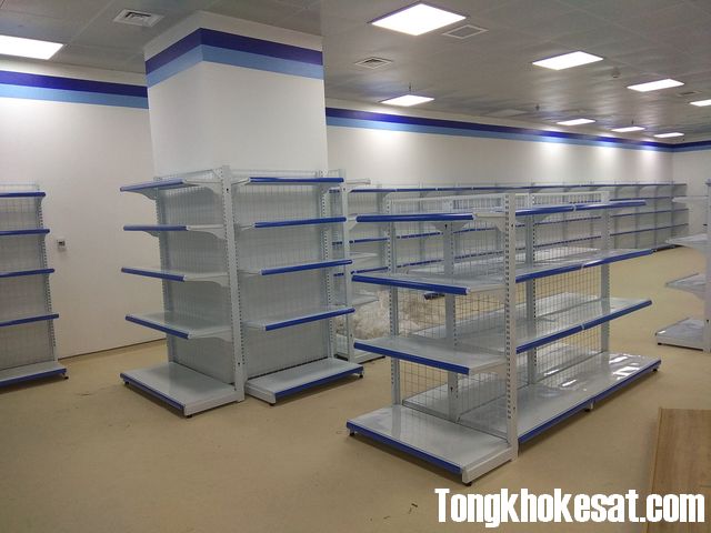 Kệ kép bày hàng 2 bên với thiết kế 4 tầng vừa để được nhiều đồ vừa có chỗ đi thoải mái cho khách hàng lựa chọn đồ